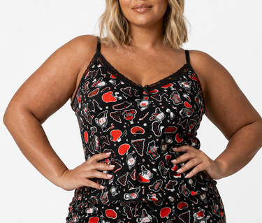 Christmas trees and gnomes and coffins wrapped in bows... what more could you want for the holiday season? Relax and enjoy the festivities in the fitted Gnomies cami top by Killstar. Made from a soft stretchy polyester elastane blend, for a comfortable and cosy fit! Features a contrast print all over, adjustable camisole straps and pretty lace trims.