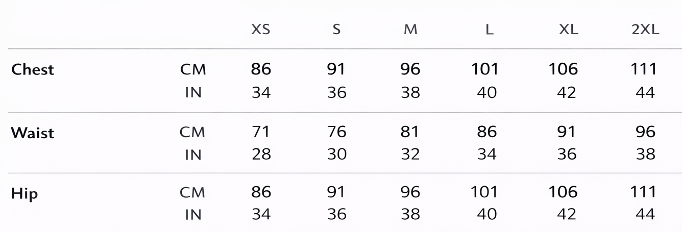 | NZ/AU | XS | S | M | L | L | XL | 2XL | 3XL |