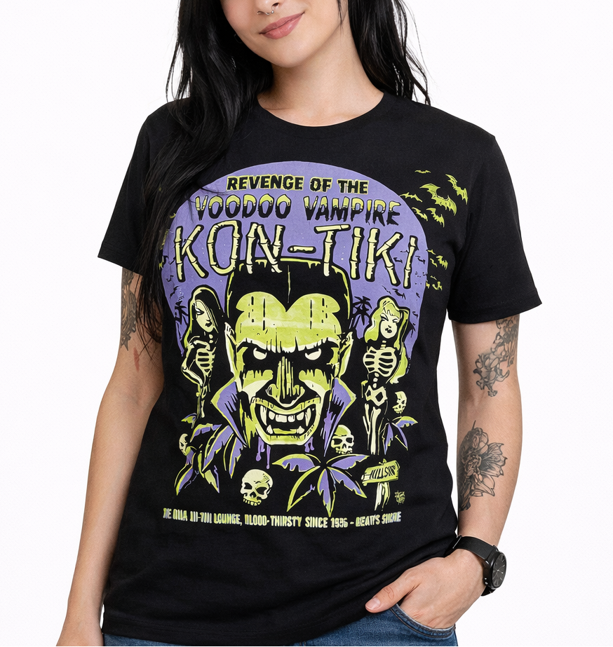 He vants to dwink yur bluddddddd! Revenge of the Voodoo Vampire wah hah haaaaaaa. Classic fit but slightly longer length t-shirt. Excellent quality cotton with a fangtastic front print on front. Plain black back, short-sleeved.