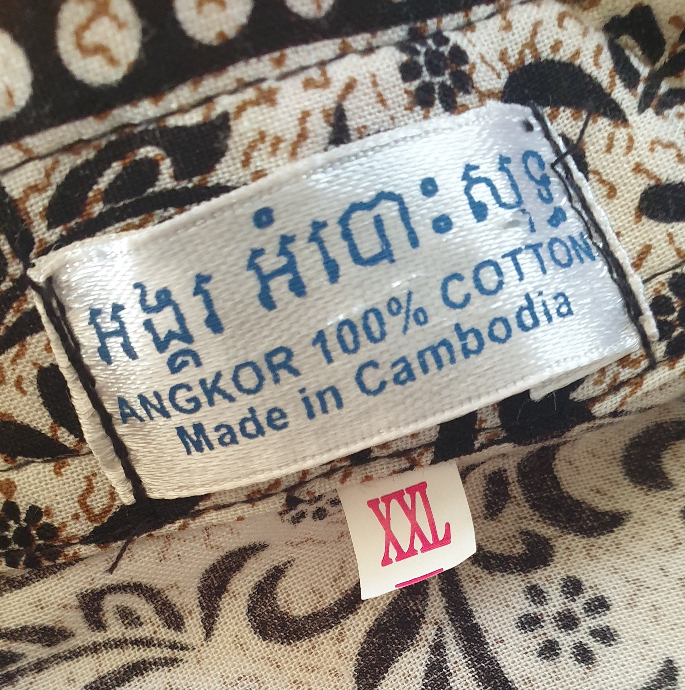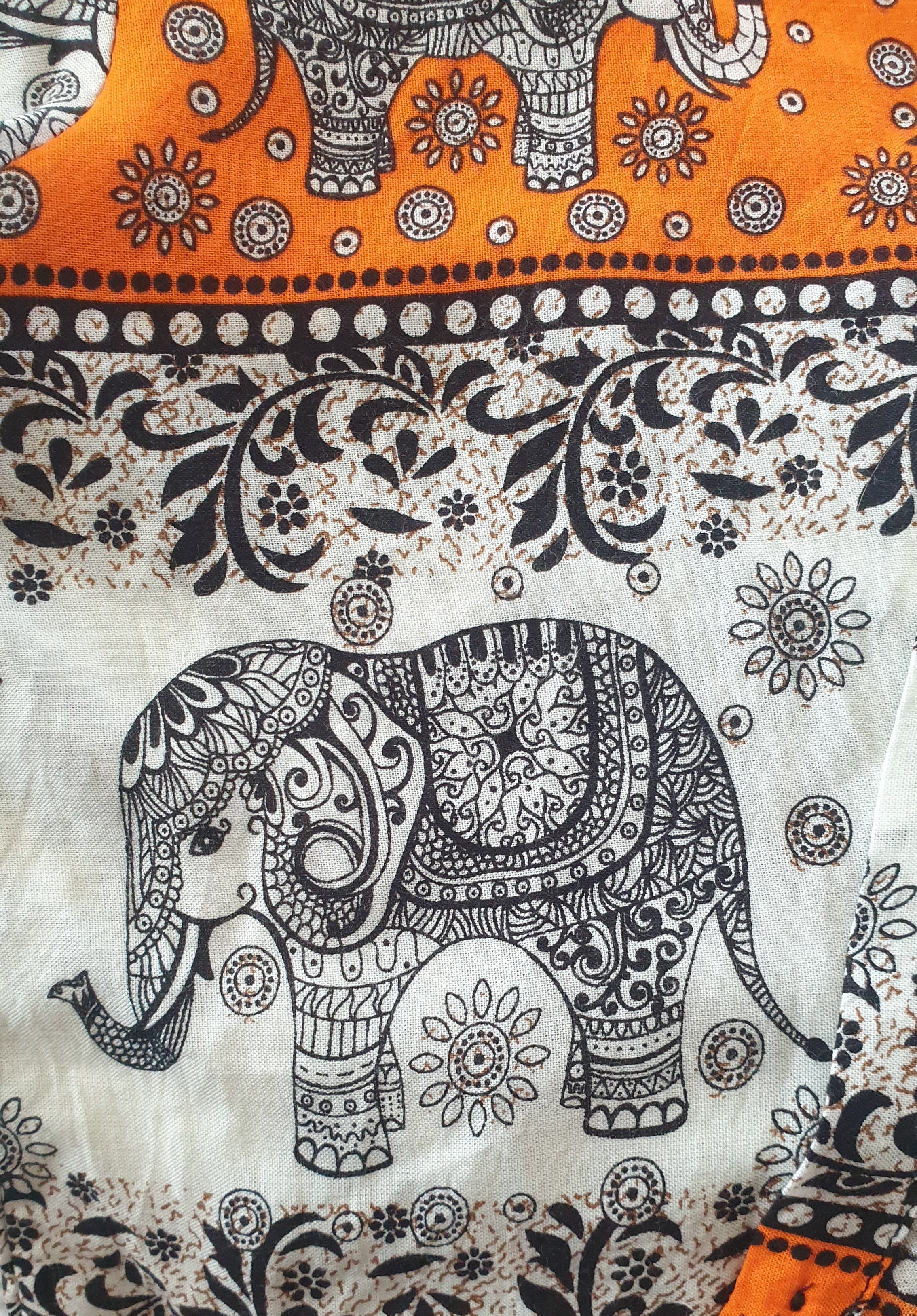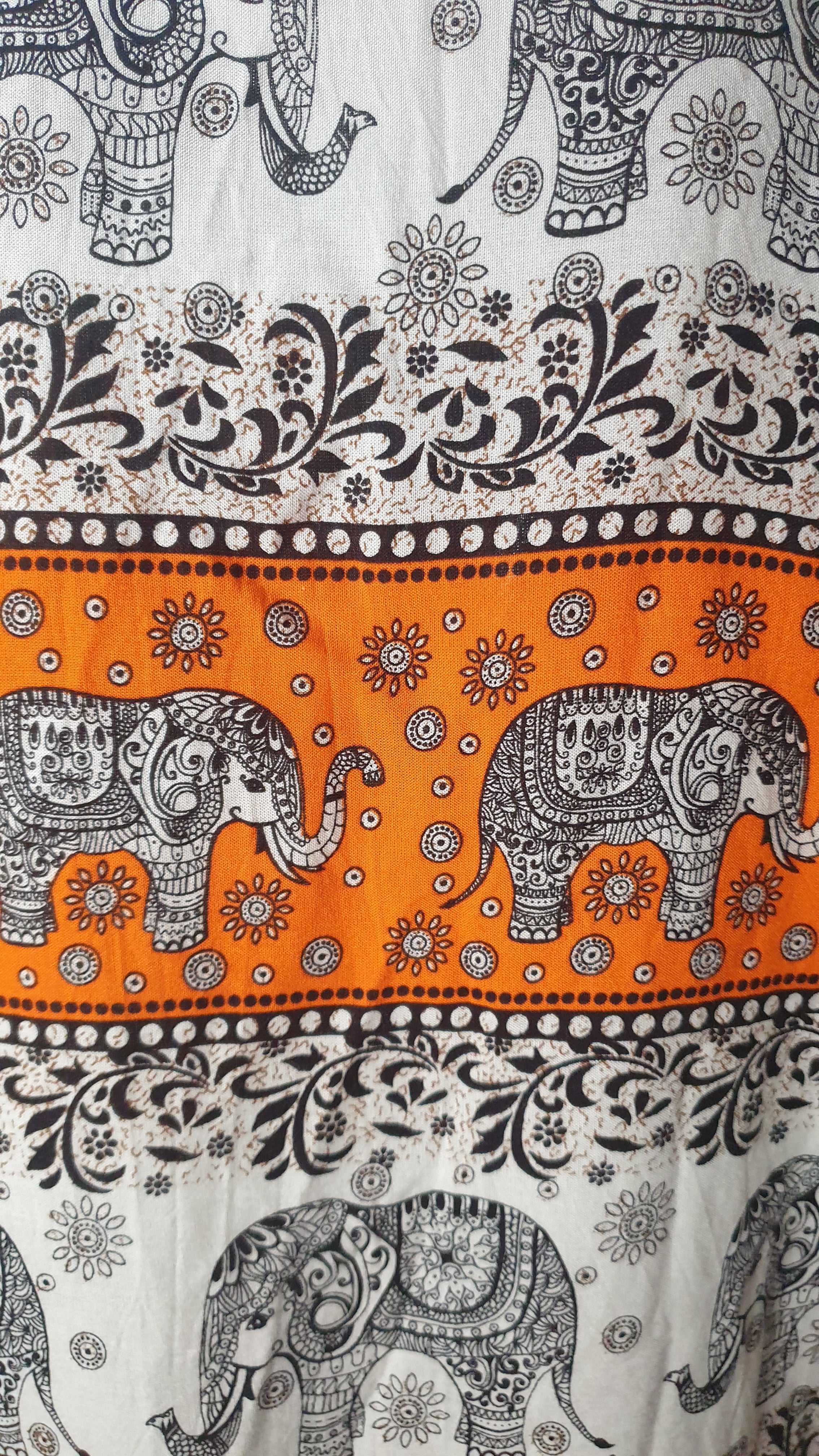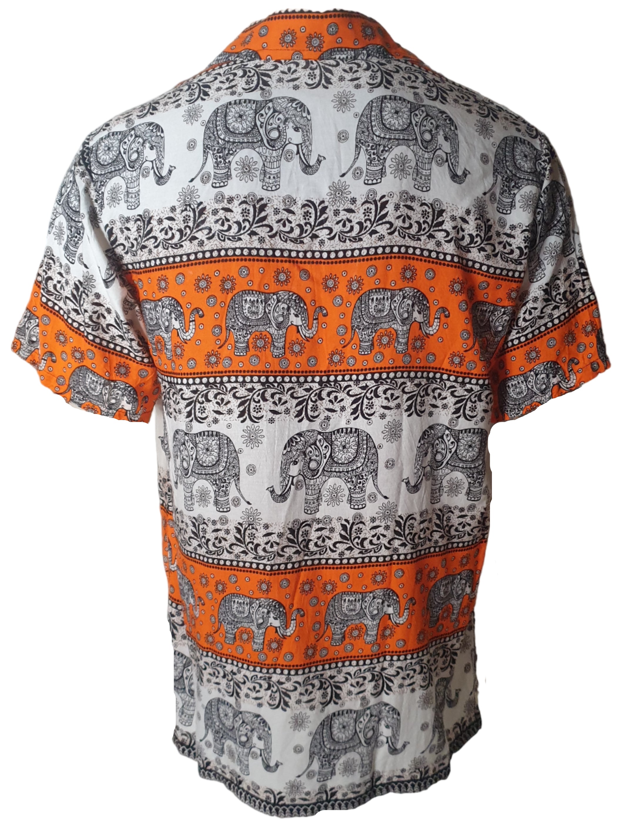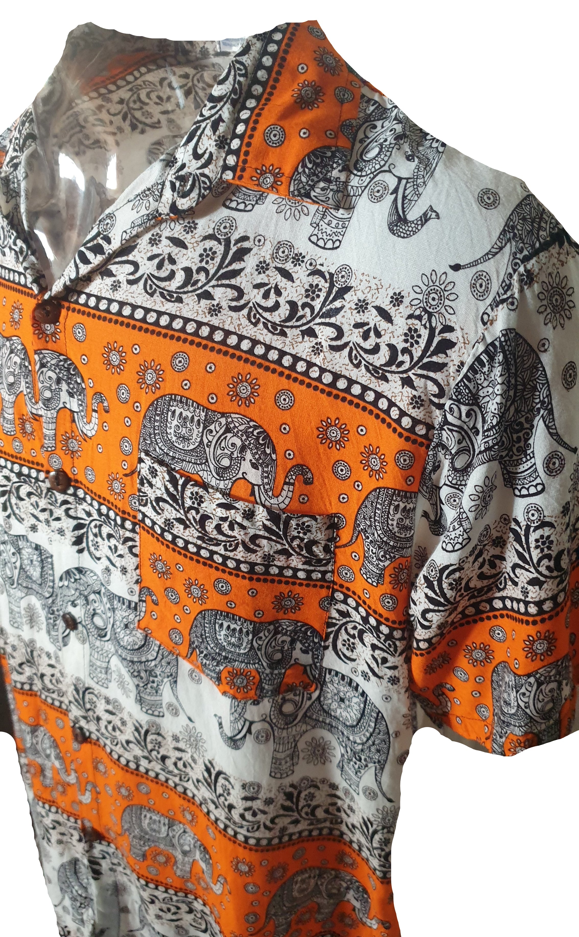 Super soft orange, white and brown tiki lounge shirt with elephants and ethnic patterns. Features coconut buttons and front chest pocket.