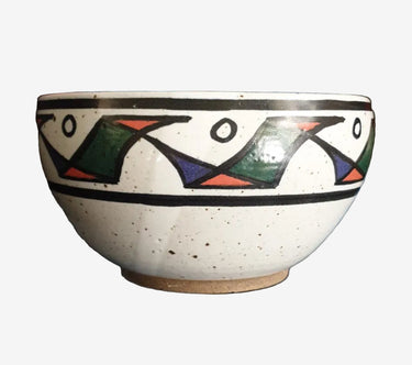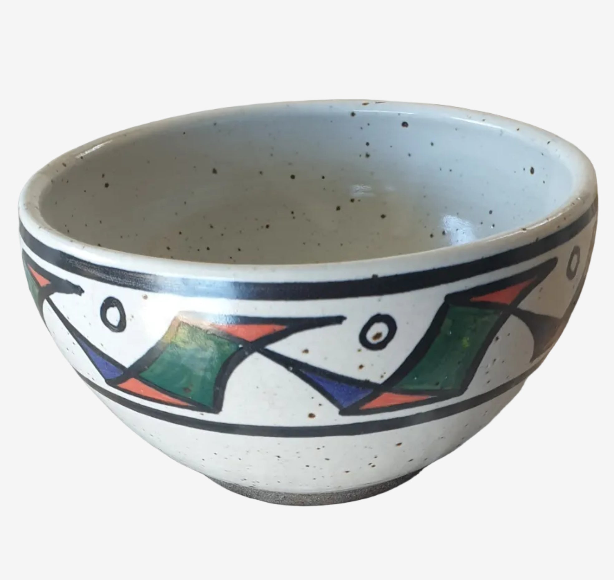 A generously sized New Zealand studio stoneware bowl with a hand-painted geometric band in earthy green, terracotta and deep blue. The clay body has a natural iron-flecked texture, with the speckling and tonal variation coming from the firing rather than wear or damage.