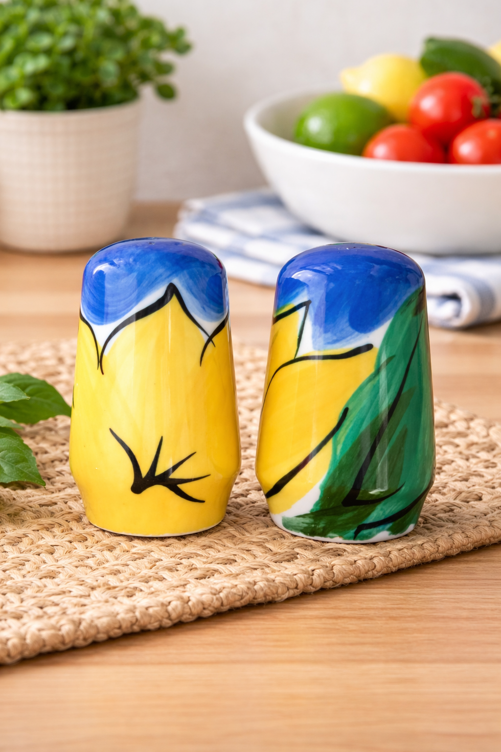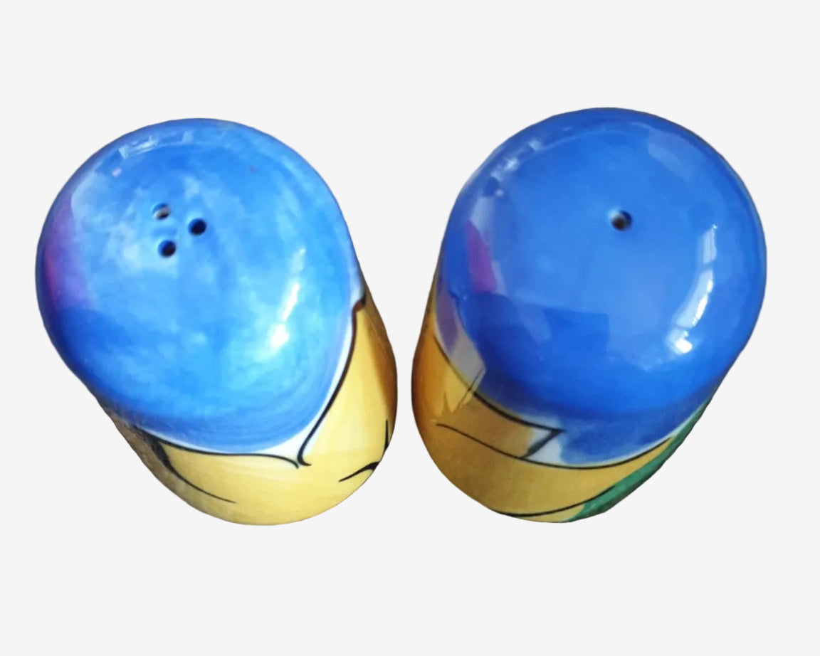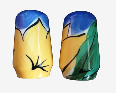 A vibrant New Zealand porcelain salt and pepper set by Petra Ceramics, finished with bold abstract floral brushwork in blue, yellow and green.