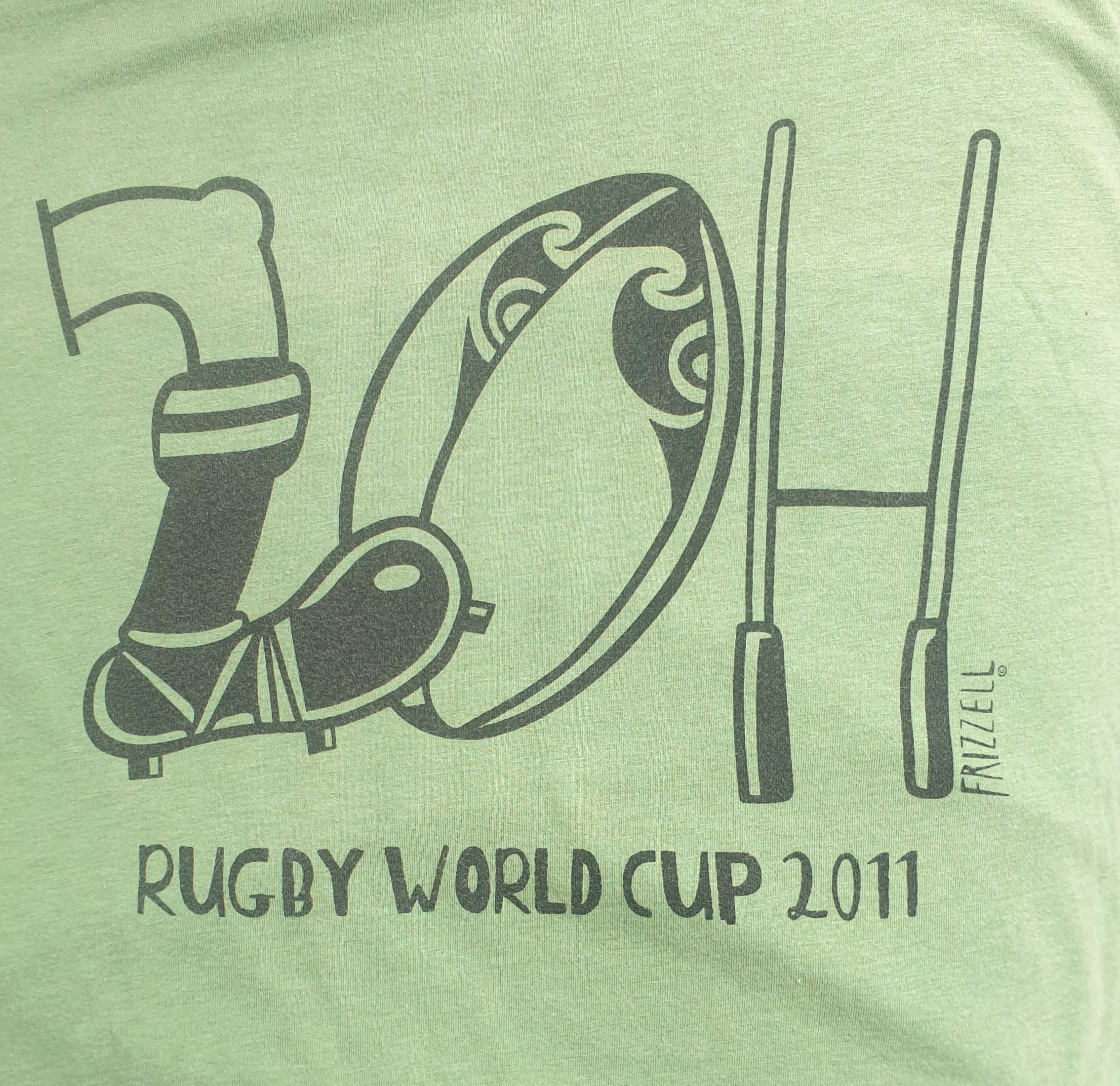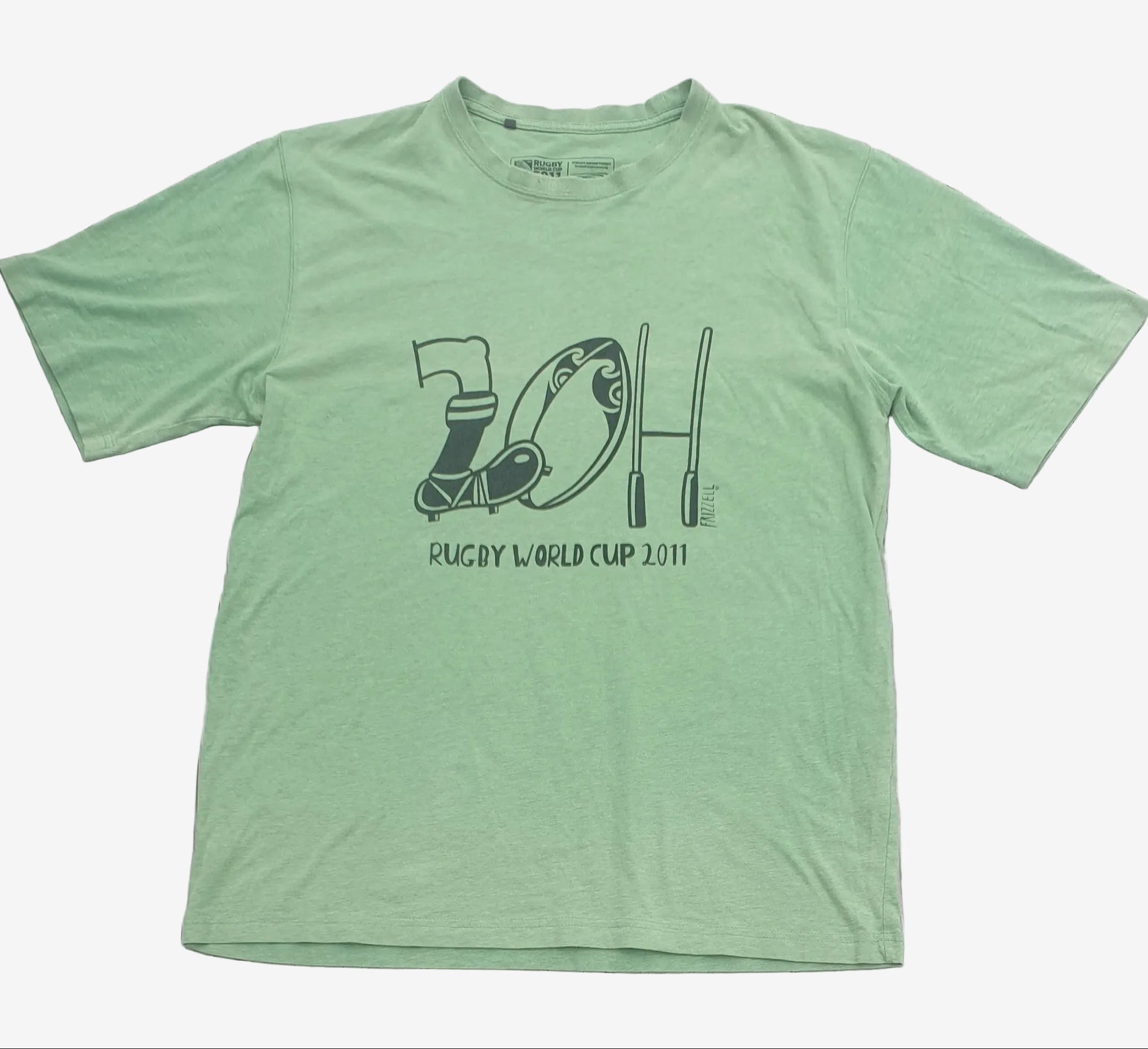 Printed on a soft green cotton tee, the design celebrates RWC 2011 in Frizzell’s distinctive illustrated style. It’s instantly recognisable — a wearable piece of New Zealand sporting history.