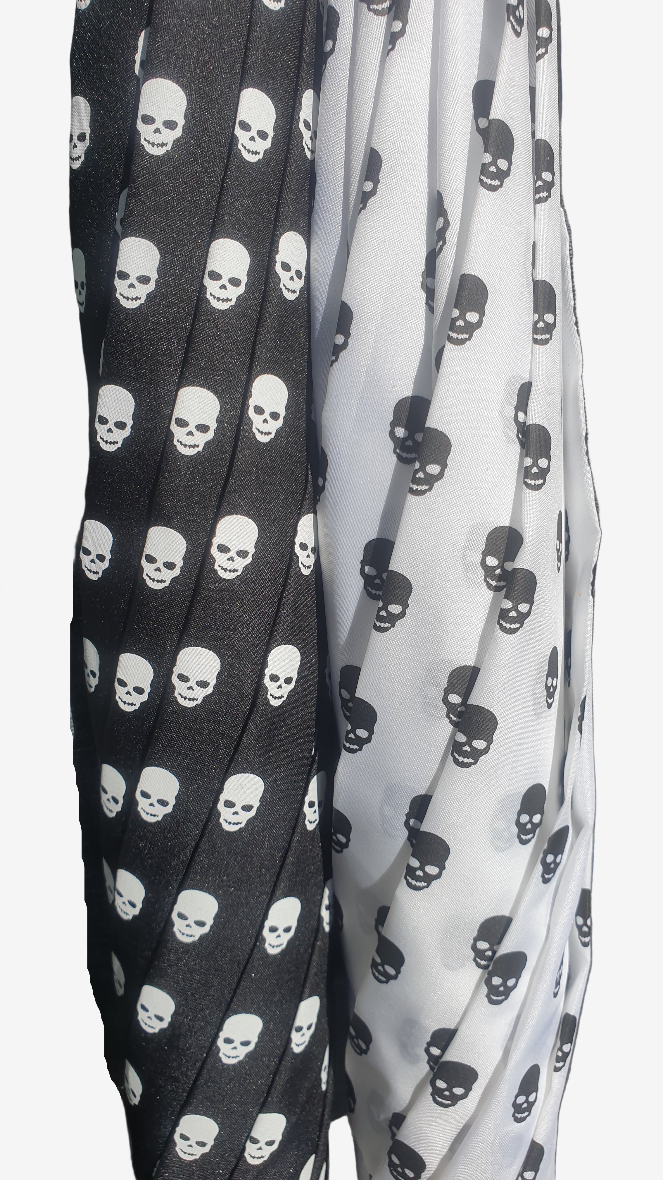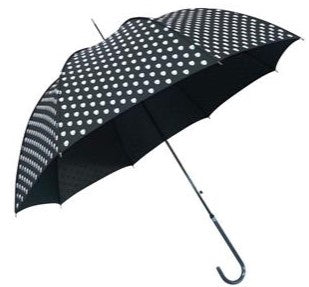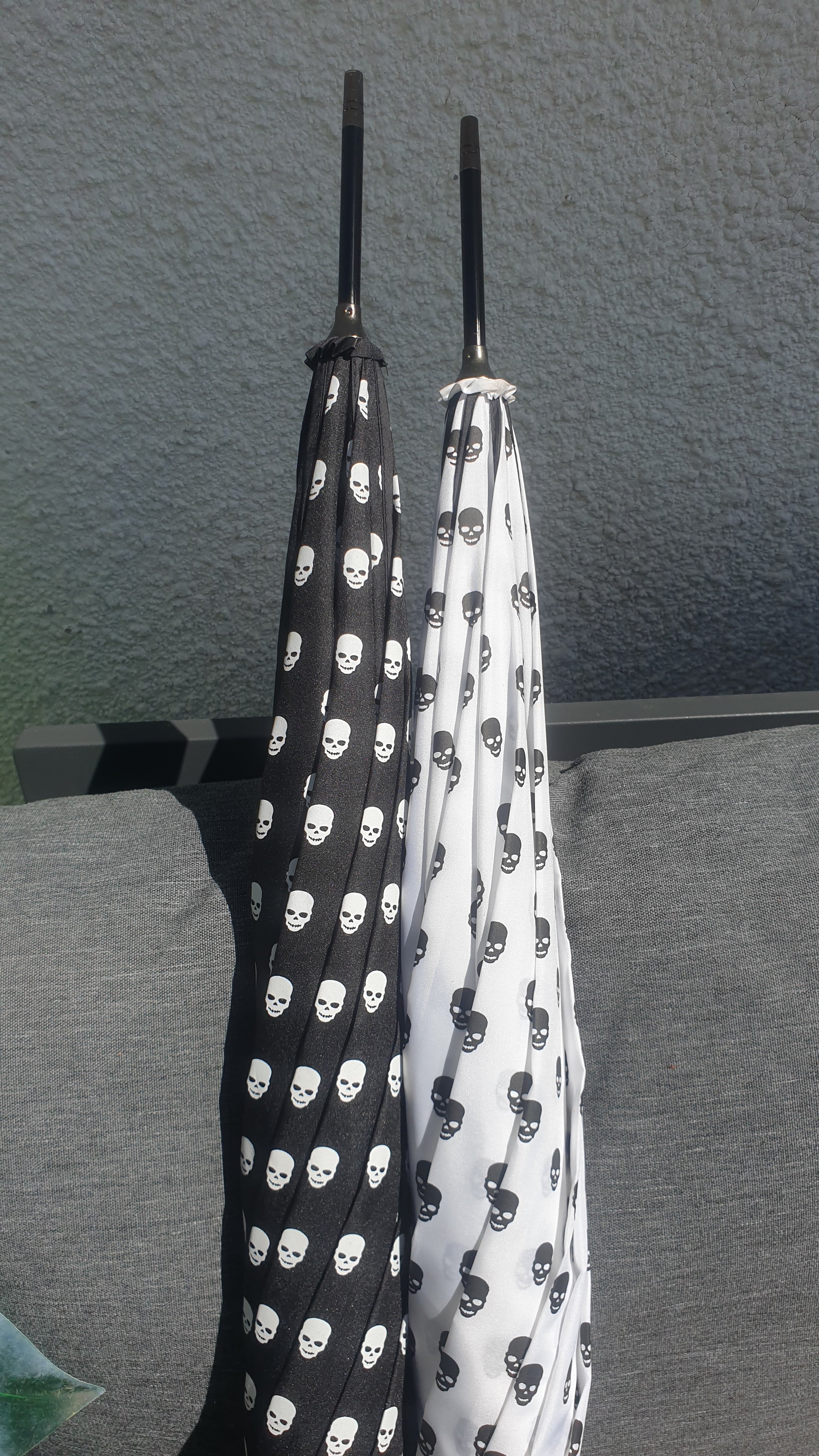 Shade in style with this striking black umbrella adorned with scattered white skulls. Featuring a comfortable rounded black handle, reinforced metal tip, and convenient velcro closure, it's the perfect accessory for sun protection, rainy days, or just making a bold statement. Edgy meets practical.