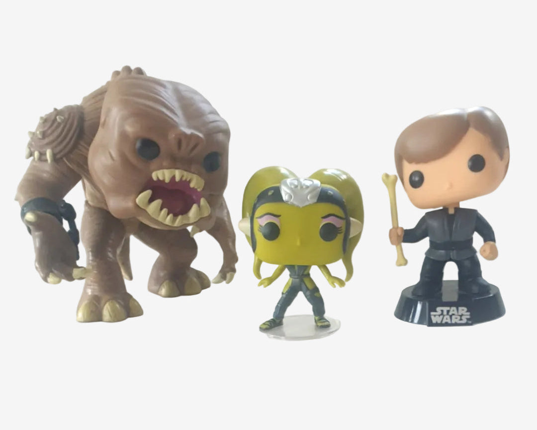 This Star Wars Pop! Vinyl trio includes Rancor, Luke Skywalker and Oola — originally released together as a 2015 3-pack and now vaulted by Funko.