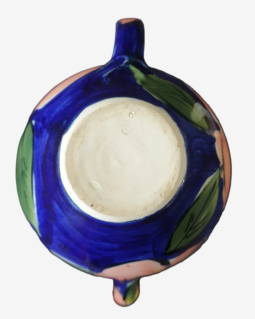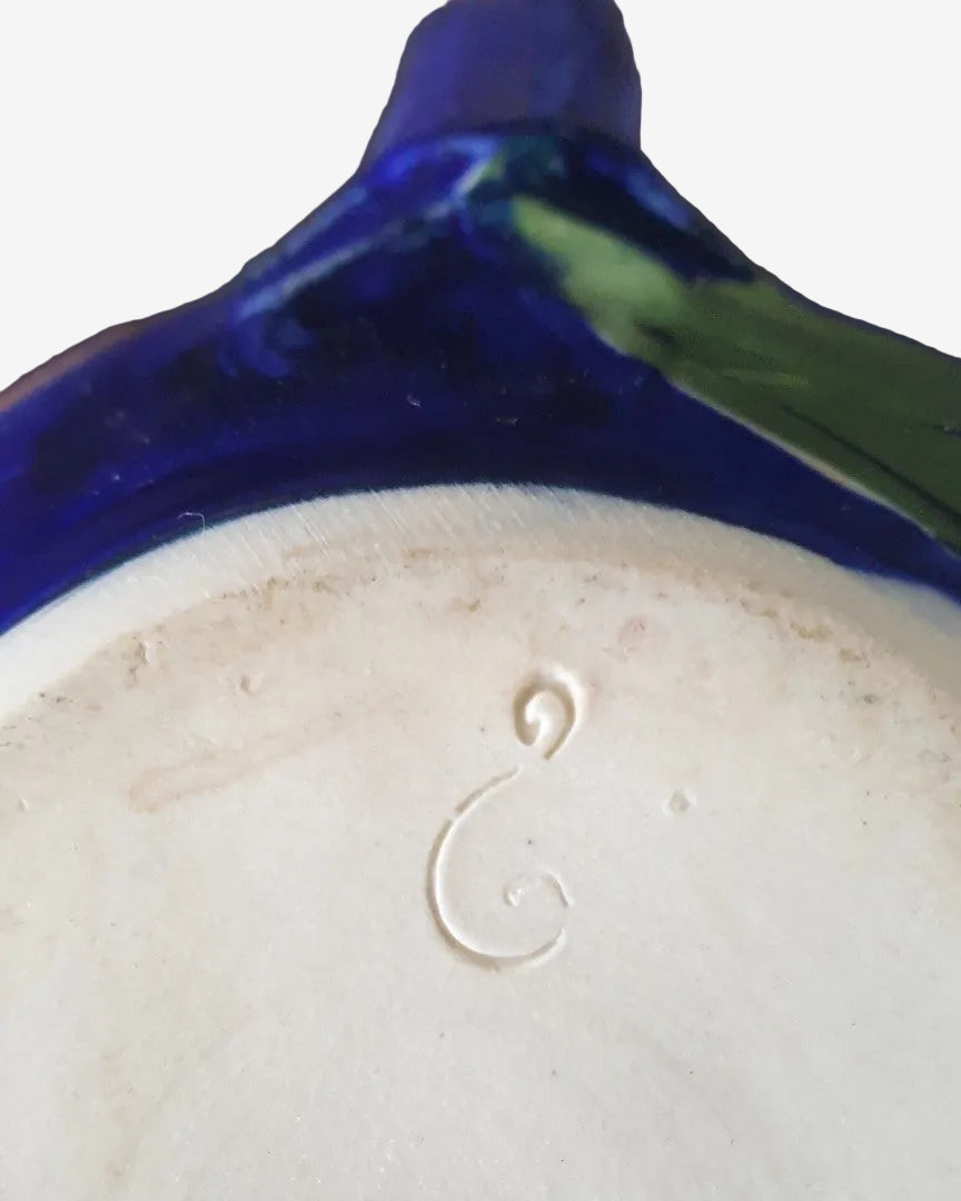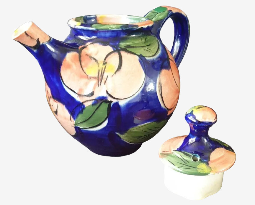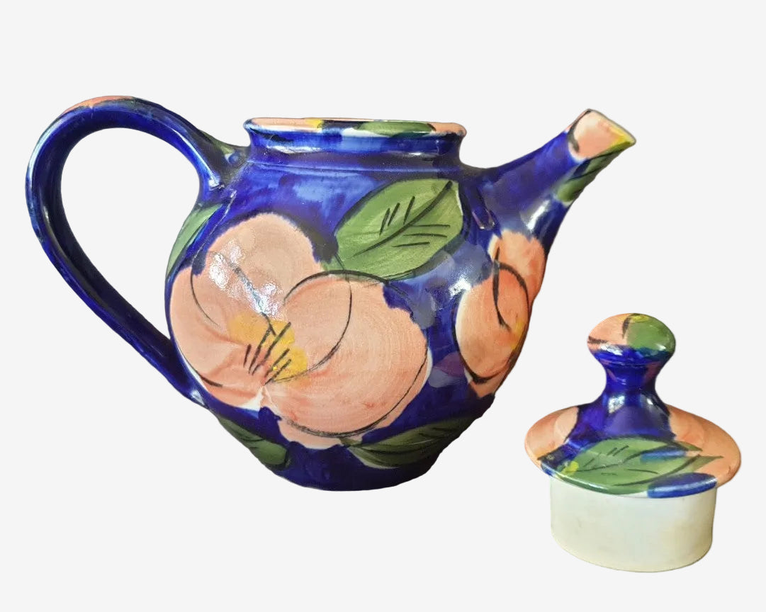 Finished in a rich cobalt blue glaze with large expressive pink florals and green leaves, this piece has the bold, confident brushwork typical of late-80s New Zealand studio ceramics. The body is wheel-thrown, with an internal spout filter and a fitted lid.
