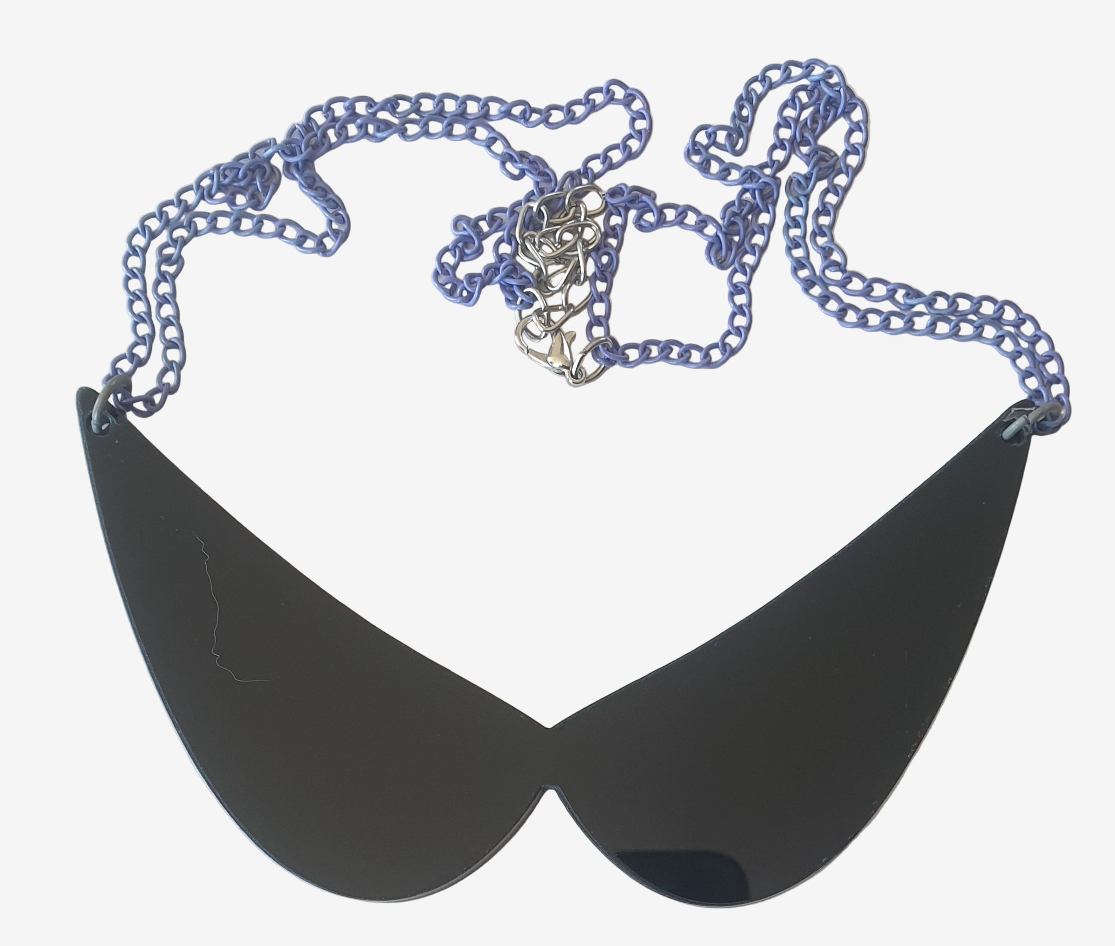 The collar is 12.5cm x 6.5cm tall. The pretty purple metal chain has an 18cm drop down to the tip of the collar plus an 8cm extender chain.