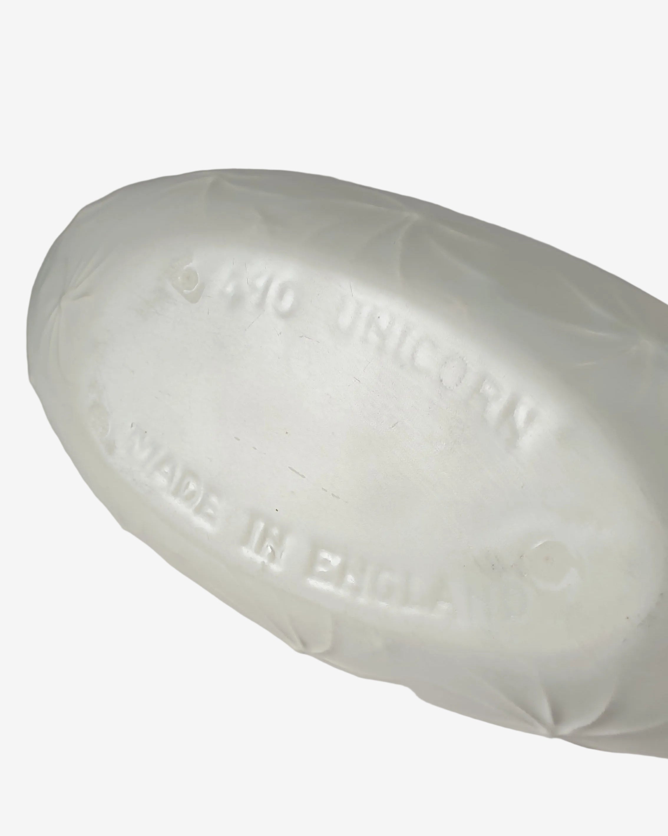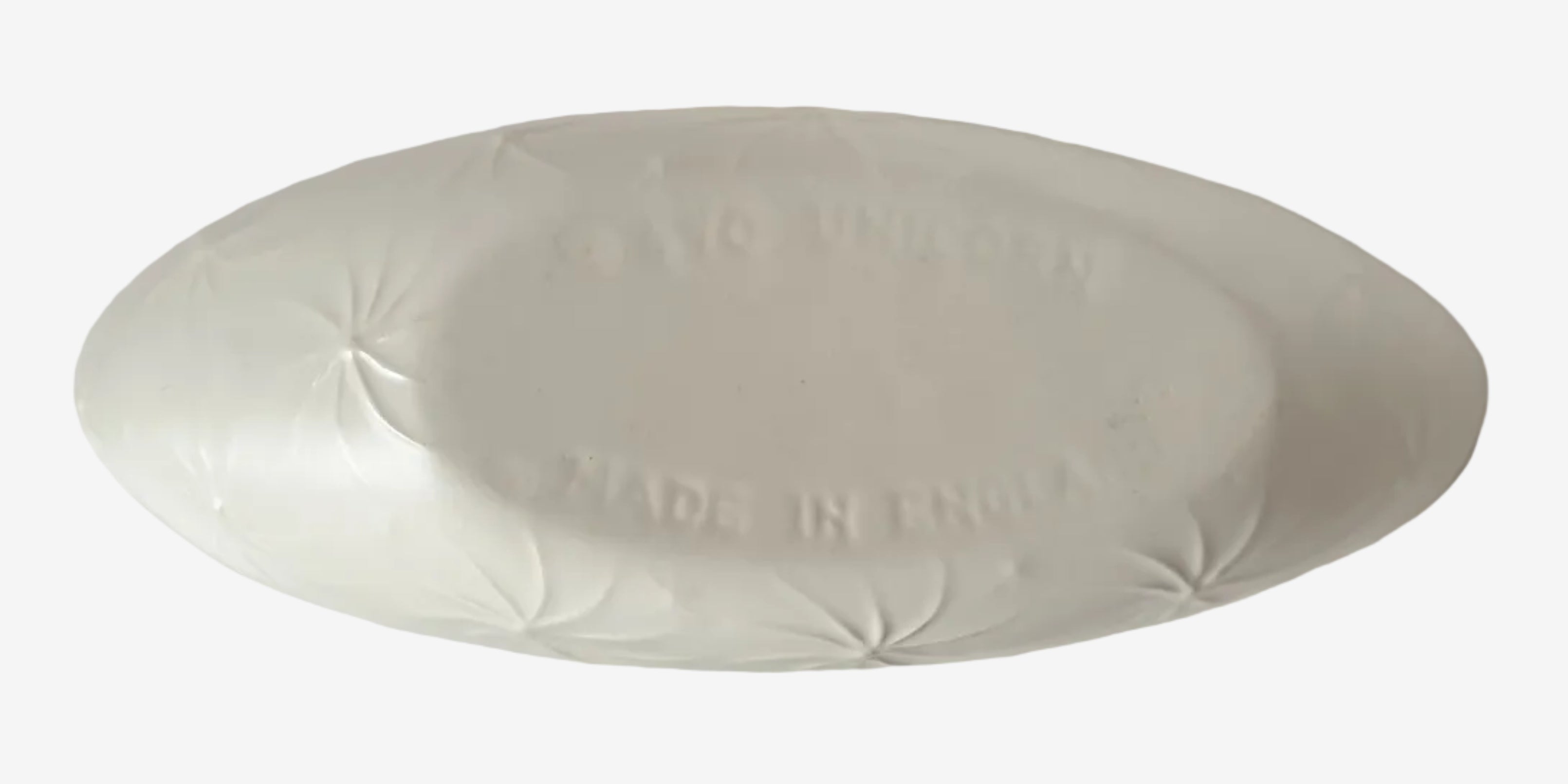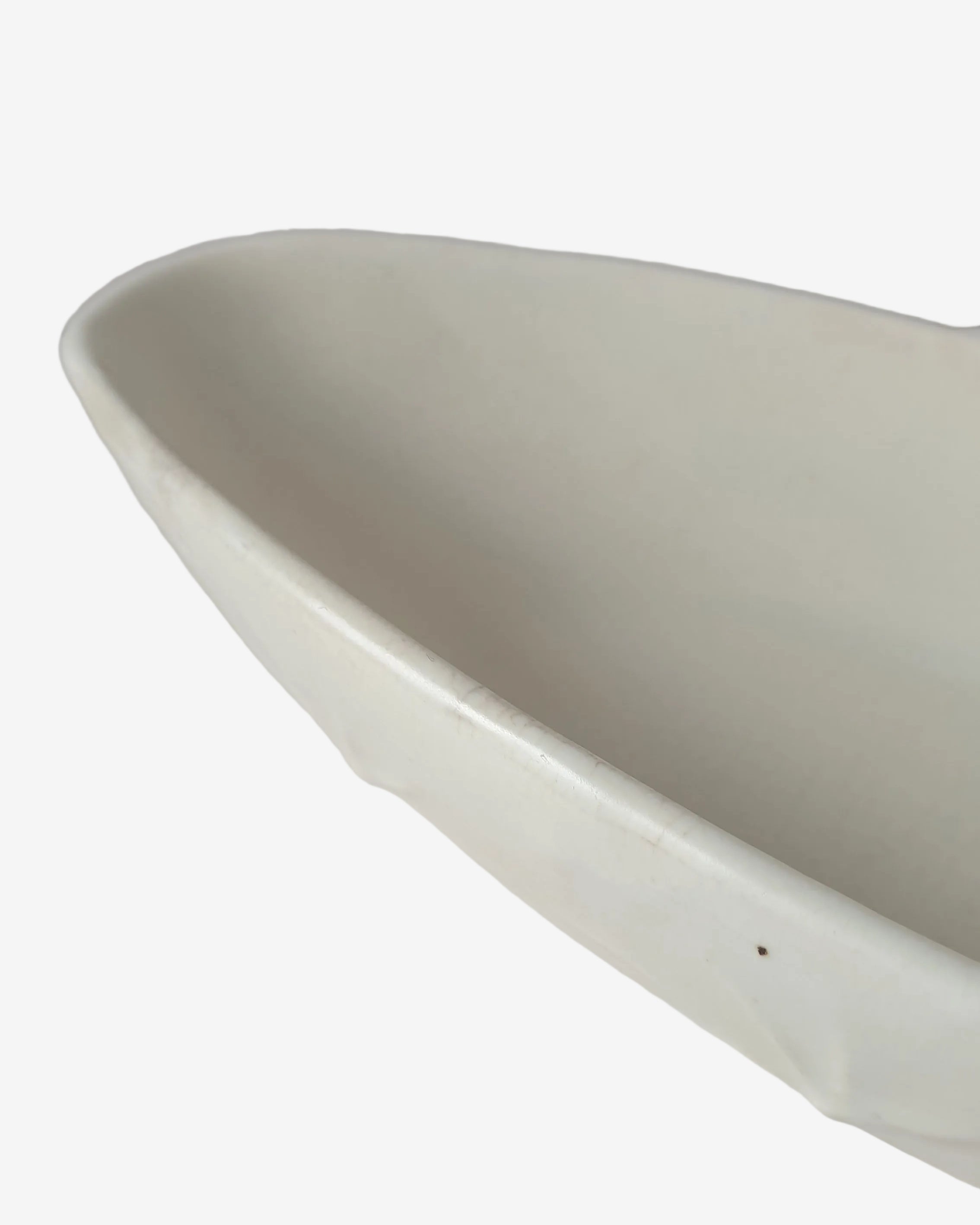 Off-white ceramic trough dish made in England by Unicorn Pottery, impressed on the base with the mark “460 UNICORN MADE IN ENGLAND”.