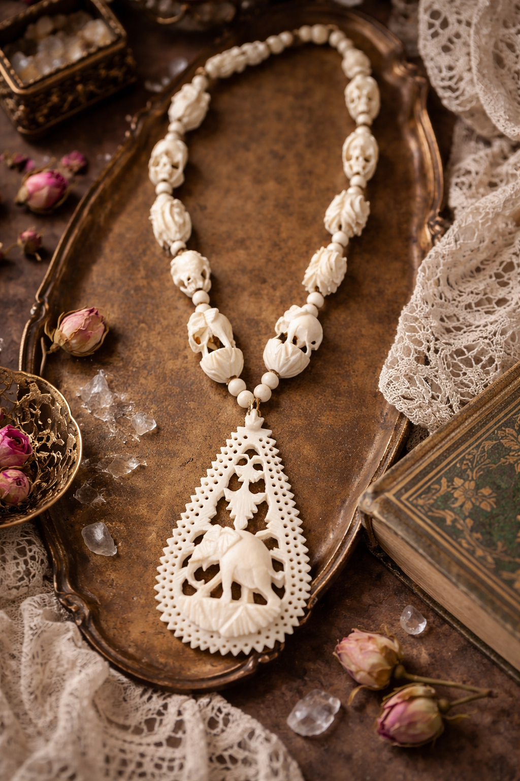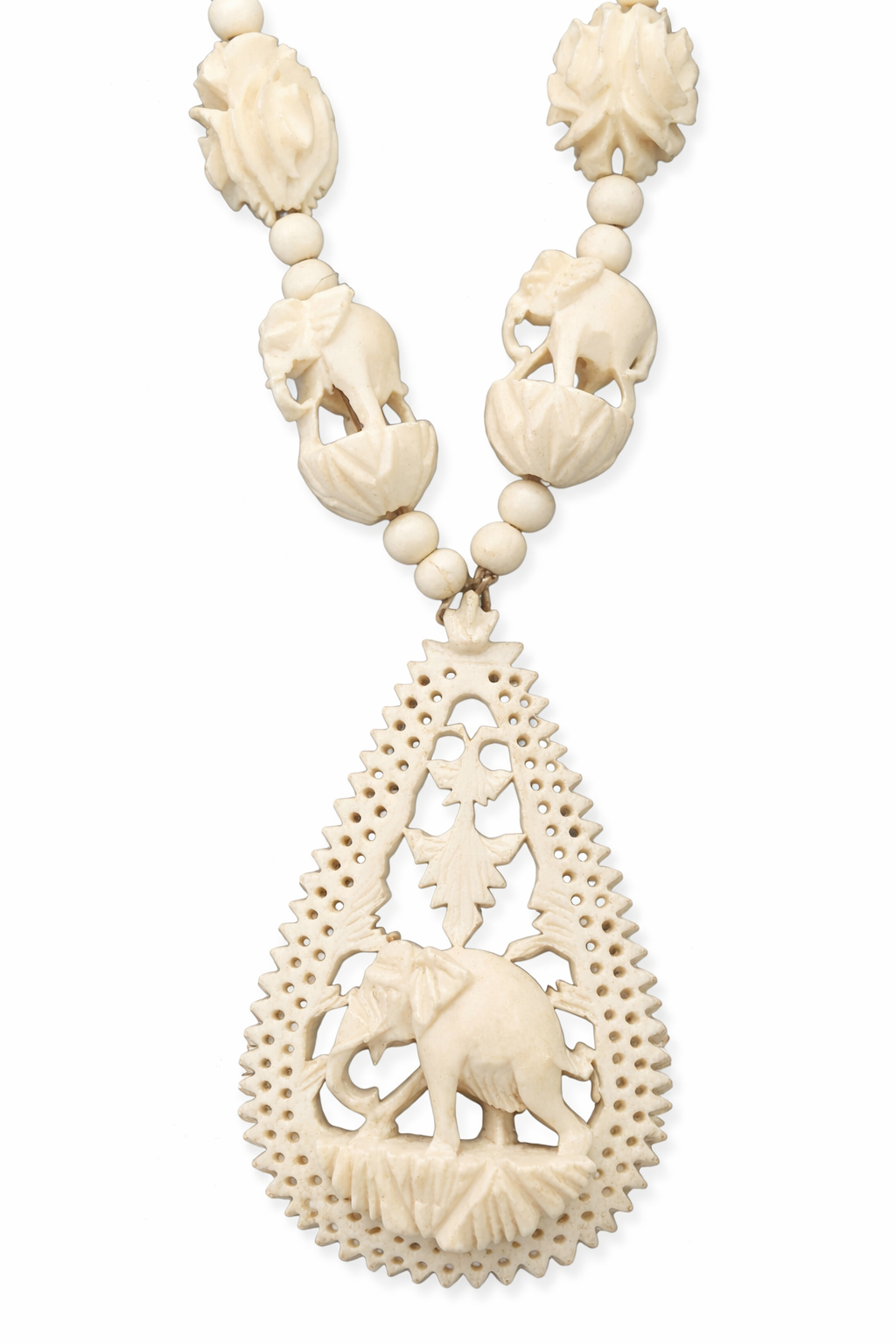 This striking vintage statement necklace features a detailed elephant motif throughout, finished with a pierced teardrop pendant carved in an intricate lace-style design. The necklace is made from an ivory-look plastic or resin typical of Asian export jewellery from the late 20th century, designed to echo the look of carved ivory without the ethical or legal concerns.