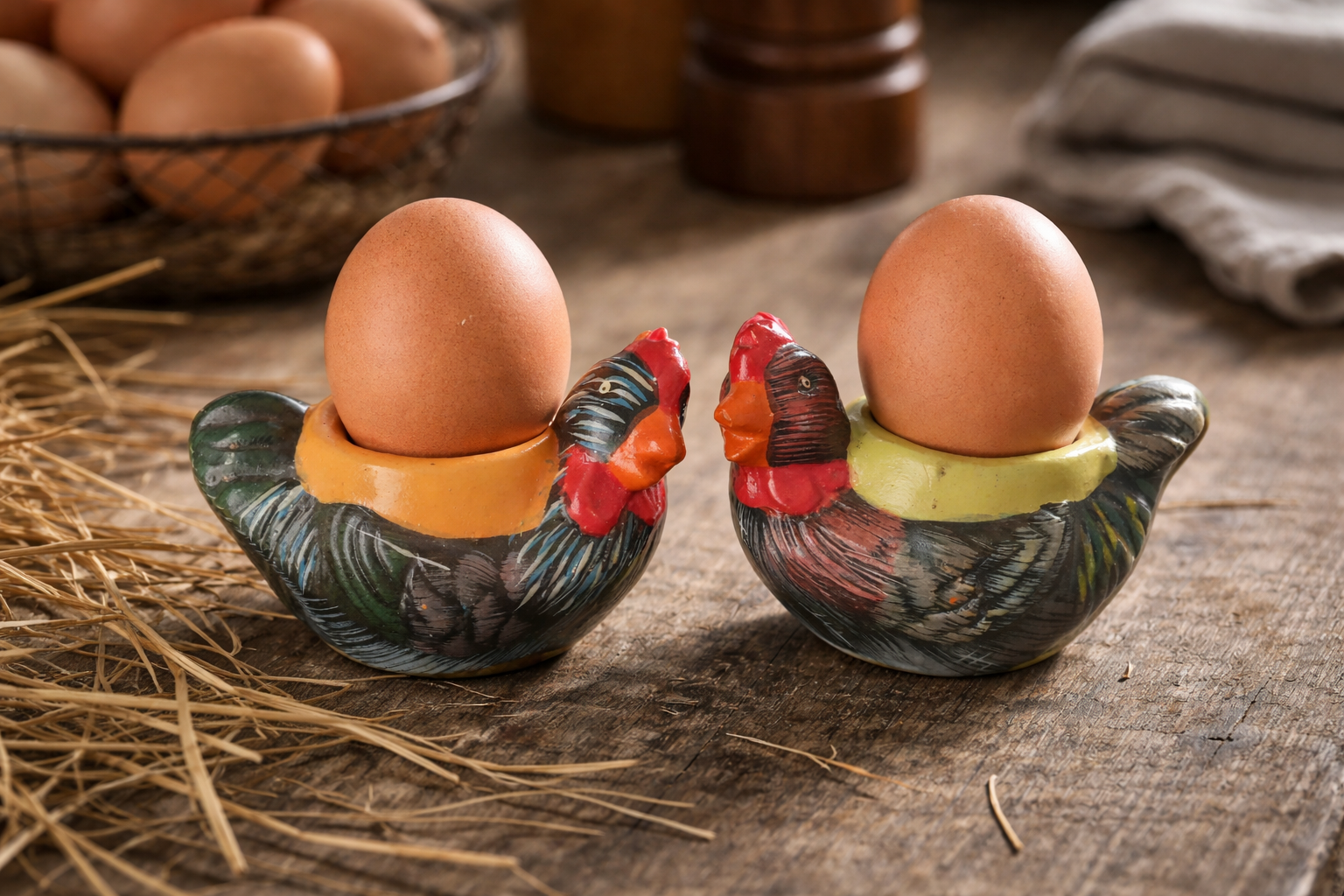 Vintage French Folk Art Chicken Egg Cups – Pair