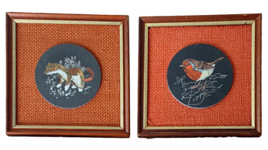 Vintage Hand-Painted English Folk Wall Art – Stoat & Robin (Pair)