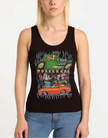 Lovely stretchy tank top singlet for the ladies. Wicked tattoo cartoon style image on the front. Trillo Metals 2018 green hot rod, flames and red racer car. What more could you want? Plain black back.