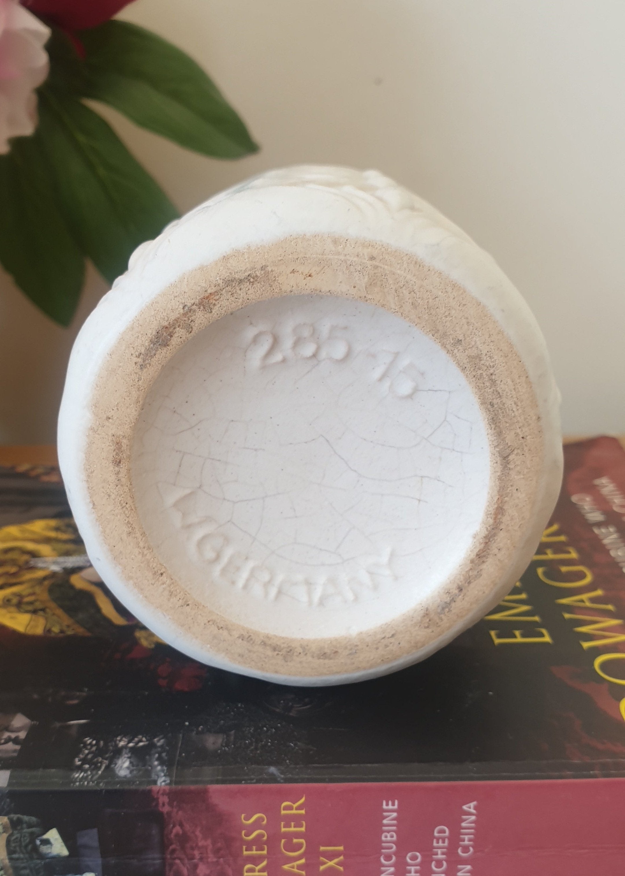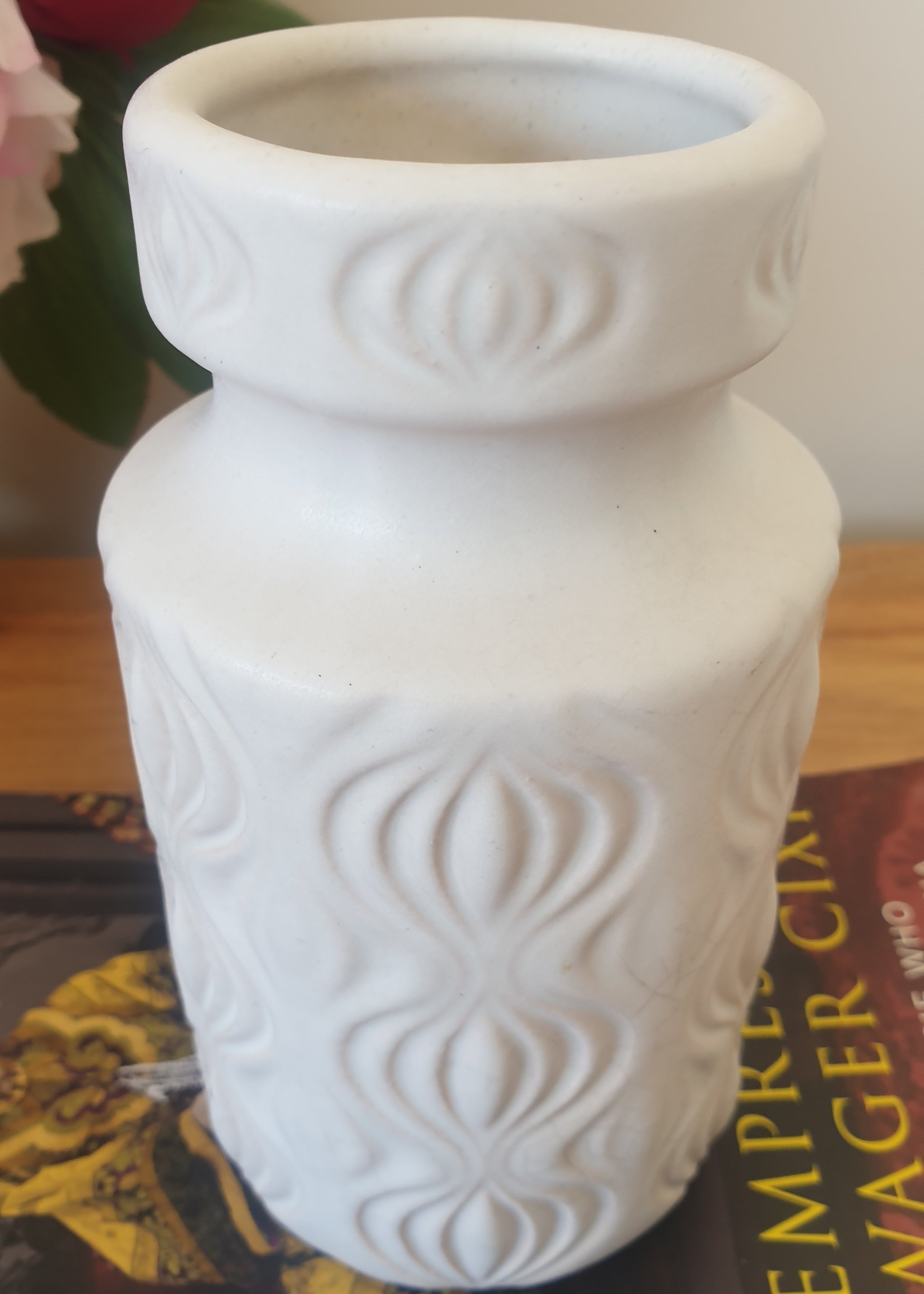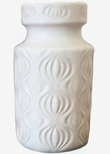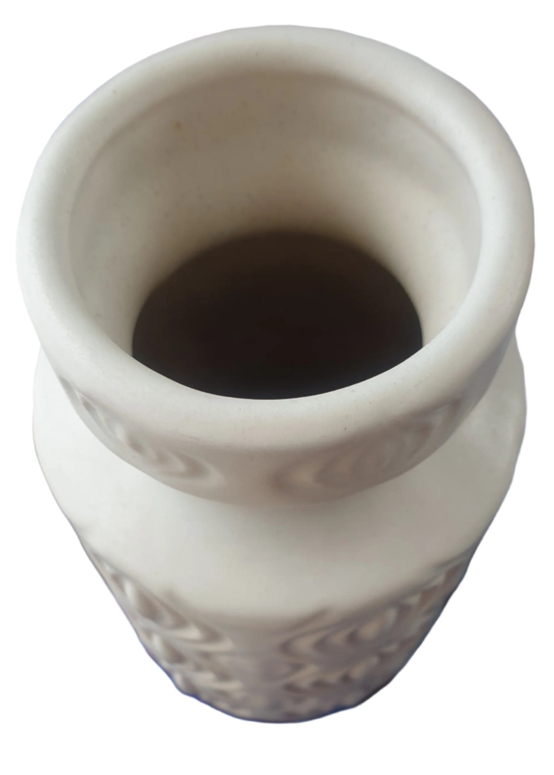 This vintage white ceramic vase was produced by Scheurich, West Germany, during the 1970s and features a classic repeating “onion” pattern typical of the era. The base is impressed with 285-15 W Germany.